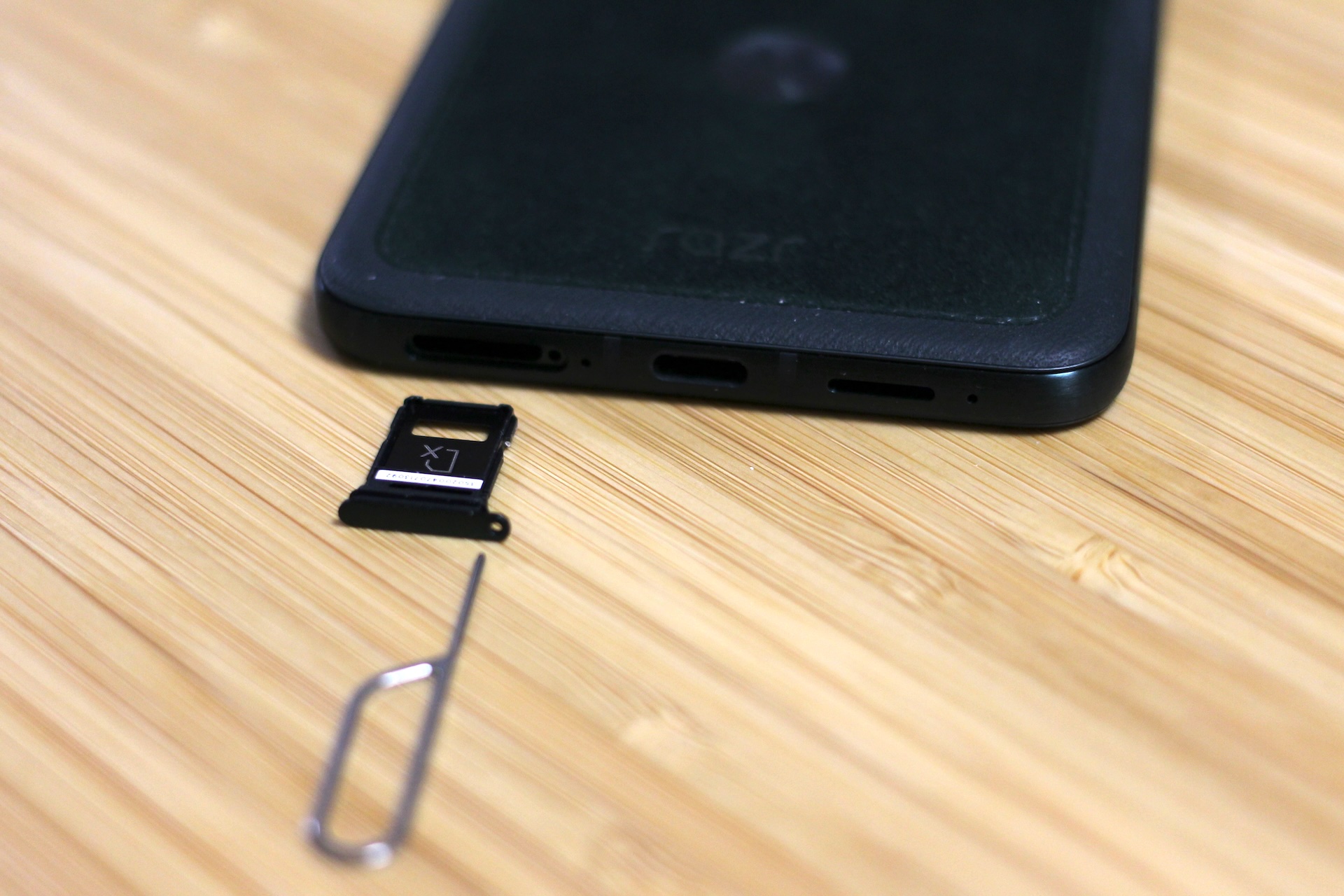 nanoSIMカードスロットのトレイを付属のSIM取り出しピンで引き出したところ。SIMはnanoSIMカードスロットが1つとeSIMのデュアルSIMデュアルVoLTE(DSDV)をサポートしています