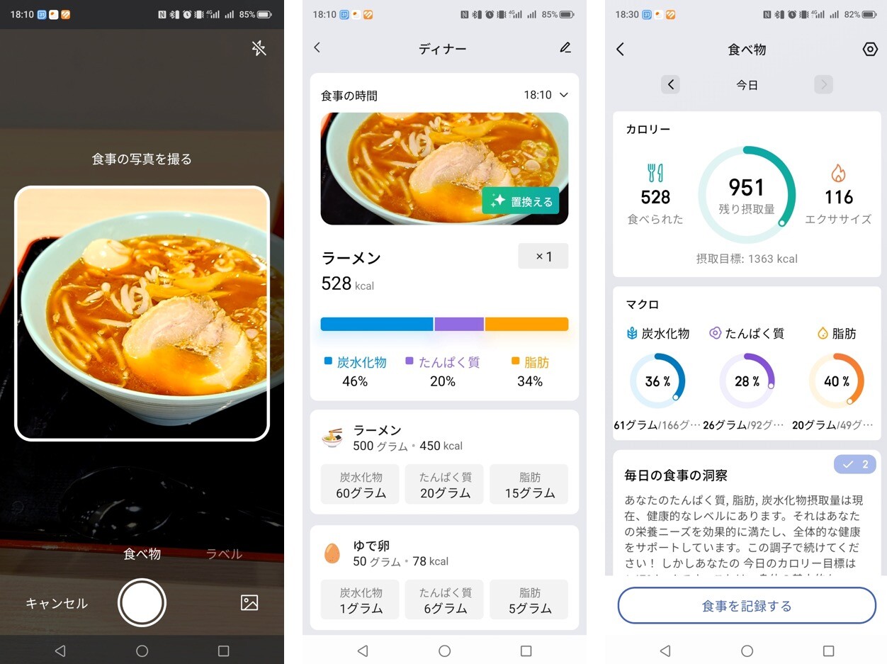 さらにスマホなど向けアプリ「Zepp」(以下、Zeppアプリ)と連携して健康データの確認が可能で、Amazfit Active Maxで取得した歩数やワークアウトにて消費カロリーがカウントされますが、Zeppアプリにて食事で取得したカロリーをカウントが可能です。AI画像認識機能を使った栄養管理「Zepp App Food Log(食事記録機能)」では食べ物の写真を撮るだけで自動的にカロリーや栄養素を分析してくれます。