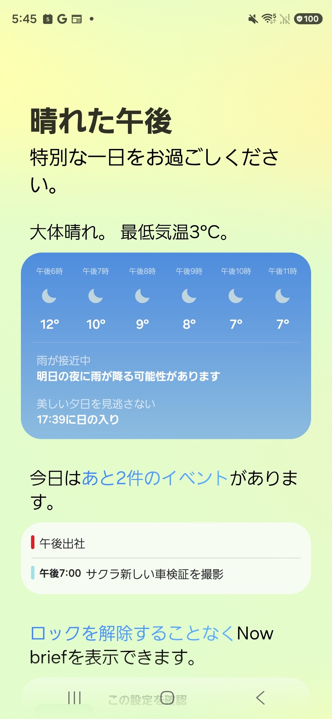 AI機能に関してはサイドボタン長押しのGoogleの「Gemini」との連携によりアプリを横断した機能が活用でき、新たに「かこって検索」の機能が強化されて複数のアイテムを認識できるようになっているほか、音声通話による詐欺の検知にも対応しています。また独自のAI機能「Galaxy AI」もいくつかの新機能が追加され、例えば、Galaxy S26シリーズのキャッチコピーとなっている「先回りするAIフォン」を体現できる「Now brief」などが利用できます。