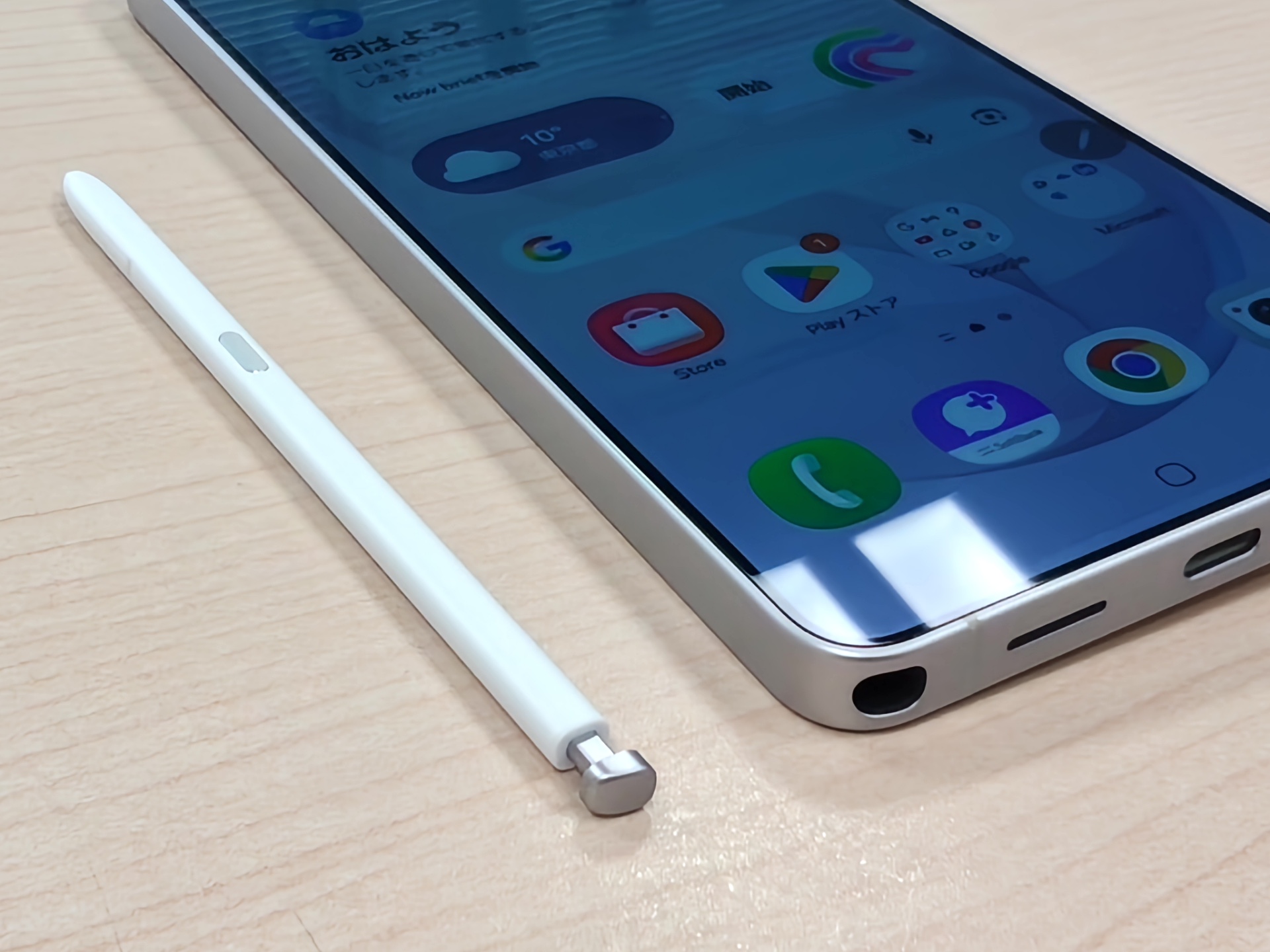 またGalaxy S26 Ultraも最近のUltraモデルの特徴でもあるSペンを本体に収納しています。Galaxy S26 Ultraの本体色は通常のブラックおよびスカイブルー、コバルトバイオレット、ホワイトの4色に加え、Samsungオンラインショップ限定のピンクゴールドおよびシルバーシャドウの2色が追加された合計6色展開で、Sペンは本体色によってホワイトとブラックの2色があります。またSペンは引き続いて4096段階の筆圧検知、IP68の防水・防塵性能をサポートしており、充電やペアリング不要で、画面から取り出すと自動的にエアコマンドメニューが起動し、ノート機能やツールにアクセスできます。なお、Bluetooth機能は省かれています。