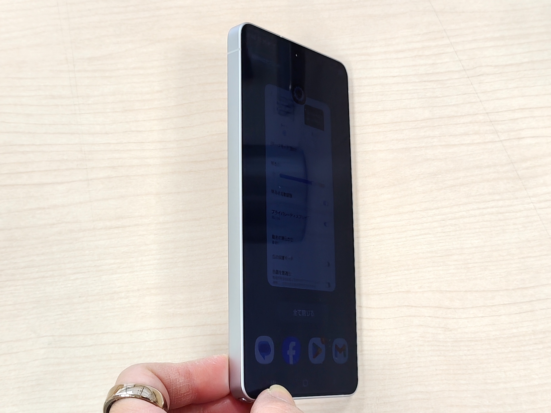 一方、新機能として「プライバシーディスプレイ」を搭載しており、プライバシーディスプレイをONにすると斜めから見えにくくなります。単に斜めから見えにくくするだけなら過去にもシャープの「ベールビュー」機能のほか、画面保護フィルムで覗き見防止を謳った製品がありましたが、Galaxy S26 Ultraのプライバシーディスプレイは画面全体だけではなく、通知部分のみや特定のアプリのみを見えにくくすることも可能です。