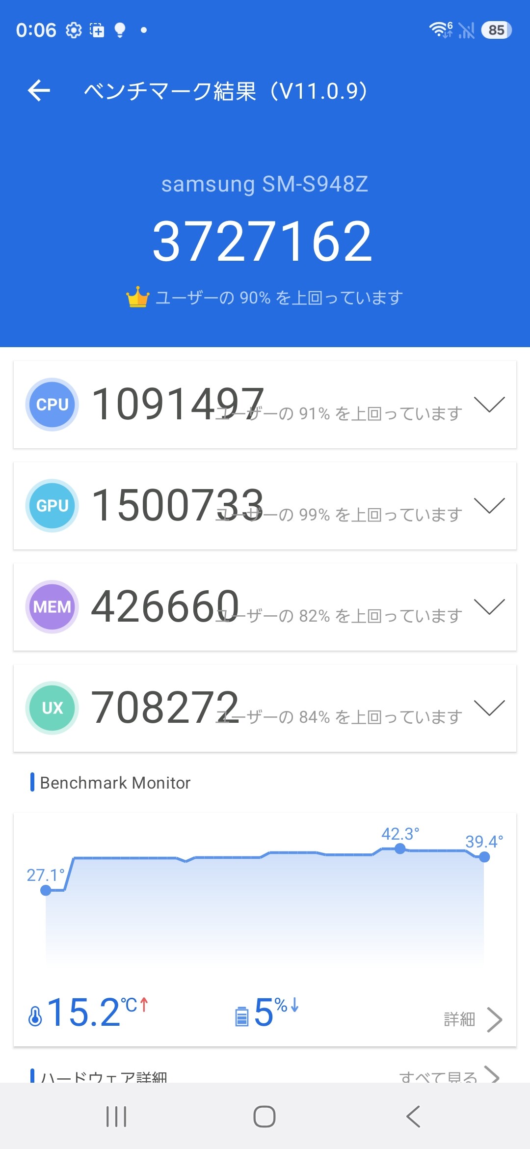 実際に、Galaxy S26 Ultraを利用してみると、ベンチマークアプリ「Antutu Benchmark」(v11)で総合スコアが370万ポイント超えの高速処理であることから“快適”の一言です。またAI写真編集やかこって検索などのAI機能の利用にもまったくストレスがありません。Now briefによるアシスト機能も天気や予定、おすすめ動画、おすすめルートなどが自然に表示されており、日常のアシスタントとしての使い勝手が向上しています。Galaxy S26 Ultraはフラッグシップモデルとしてすべての機能に満足できるモデルで、最高峰のスマホを使いたい人には是非オススメしたい機種となっていると感じました。