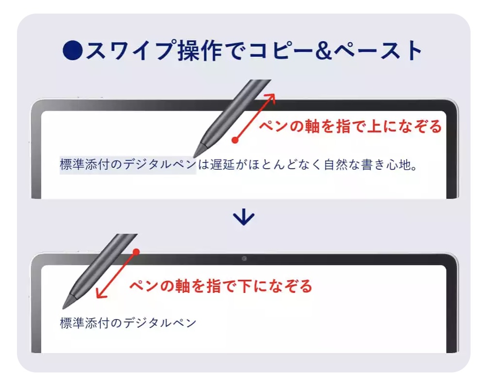 また大画面ながら持ち運びやすい軽量・薄型設計で、本体はサイズが約165.84×255.52×6.2mm、質量が約460g、色が薄い灰色のシーシェルの1色のみとなっており、IPX3準拠の防滴とIP5X準拠の防塵は対応しています。さらに同梱のデジタルペンはマグネット充電式で、8192階の筆圧検知と傾き検知に対応しており、低遅延で紙に書くような自然な書き心地を実現し、ダブルタップやスワイプによるツール切り替えにも対応します。筆記音やハプティクス(振動)によるアナログに近いフィードバックで制作体験をより豊かにします。