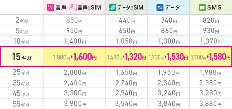 現在は15ギガプランの音声SIM・音声eSIMが月額1,800円(2回線以上利用なら家族割引で100円OFF)、データeSIM(NTTドコモ回線のみ)が月額1,430円、データSIM(タイプDのみ)が月額1,730円、SMS機能付きSIMが月額1,780円ですが、改訂によって15ギガプランの音声SIM・音声eSIMが月額1,600円(2回線以上利用なら家族割引で100円OFF)、データeSIM(NTTドコモ回線のみ)が月額1,320円、データSIM(タイプDのみ)が月額1,530円、SMS機能付きSIMが月額1,580円となります。
