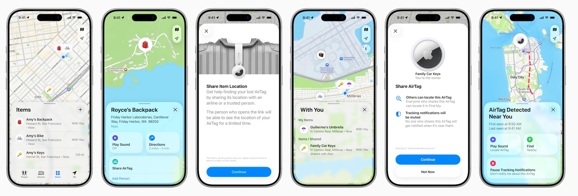 他にも新しいAirTagは「持ち物の位置情報を共有」とスムーズに連係し、位置情報を航空会社などの信頼できる他社と一時的かつ安全に共有することによって置き忘れた持ち物を取り戻せるように手伝うための機能です。これにより、航空会社は遅延手荷物やその他の紛失物を見つけ出して持ち主のもとに戻すサポートがしやすくなり、Appleは50を超える航空会社と直接提携して「持ち物の位置情報を共有」のリンクをプライバシーを保護しながら安全に利用できるようにしています。