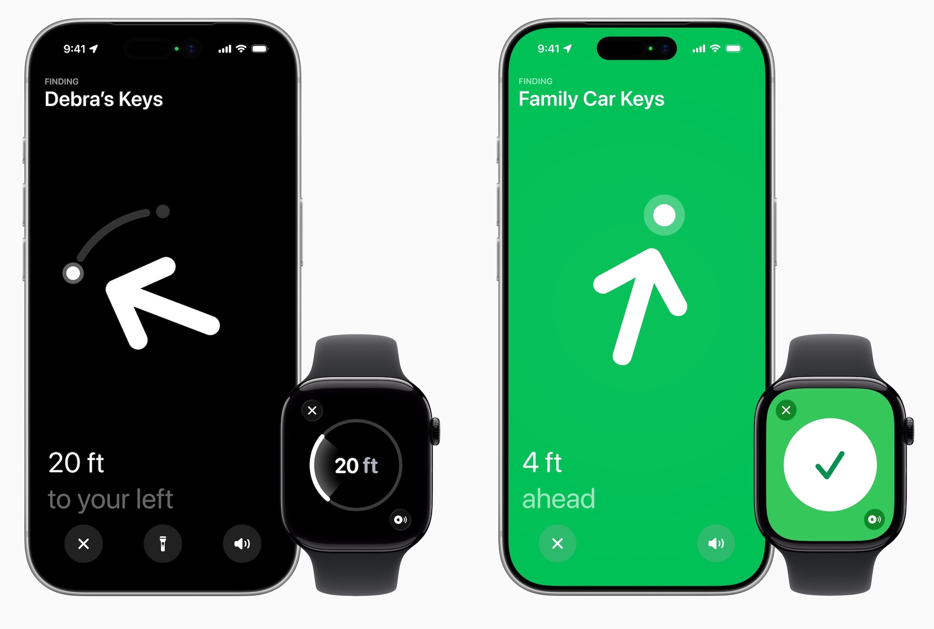 新たにiPhone 17シリーズやiPhone Air、Apple Watch Ultra 3、Apple Watch Series 11にも搭載されているAppleの第2世代の超広帯域(UWB)チップによってAirTag(第2世代)はこれまで以上に簡単に持ち物を見つけられるようになりっており、Appleの「探す」アプリを使って「正確な場所を見つける」機能によって触覚的かつ視覚的、聴覚的なフィードバックを使い、前世代よりも最大50%も遠い位置から紛失した持ち物のある場所へと導きます。
