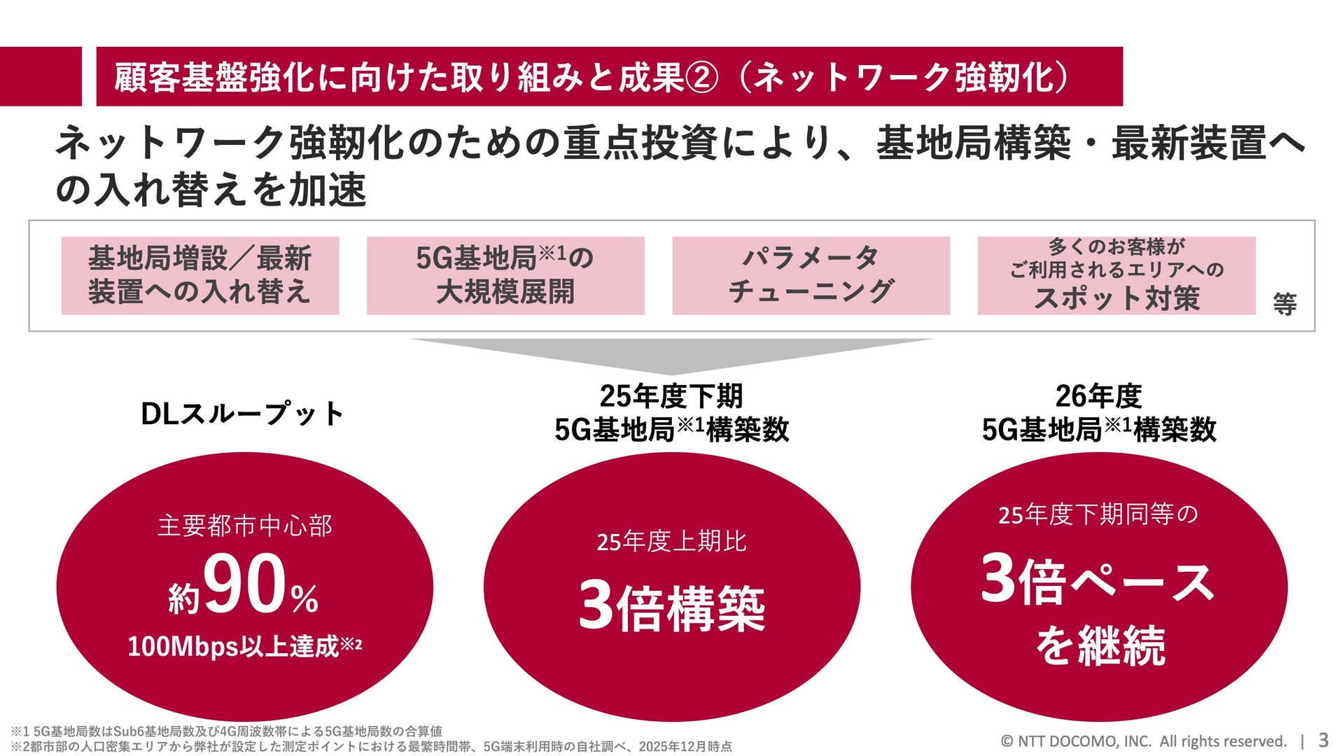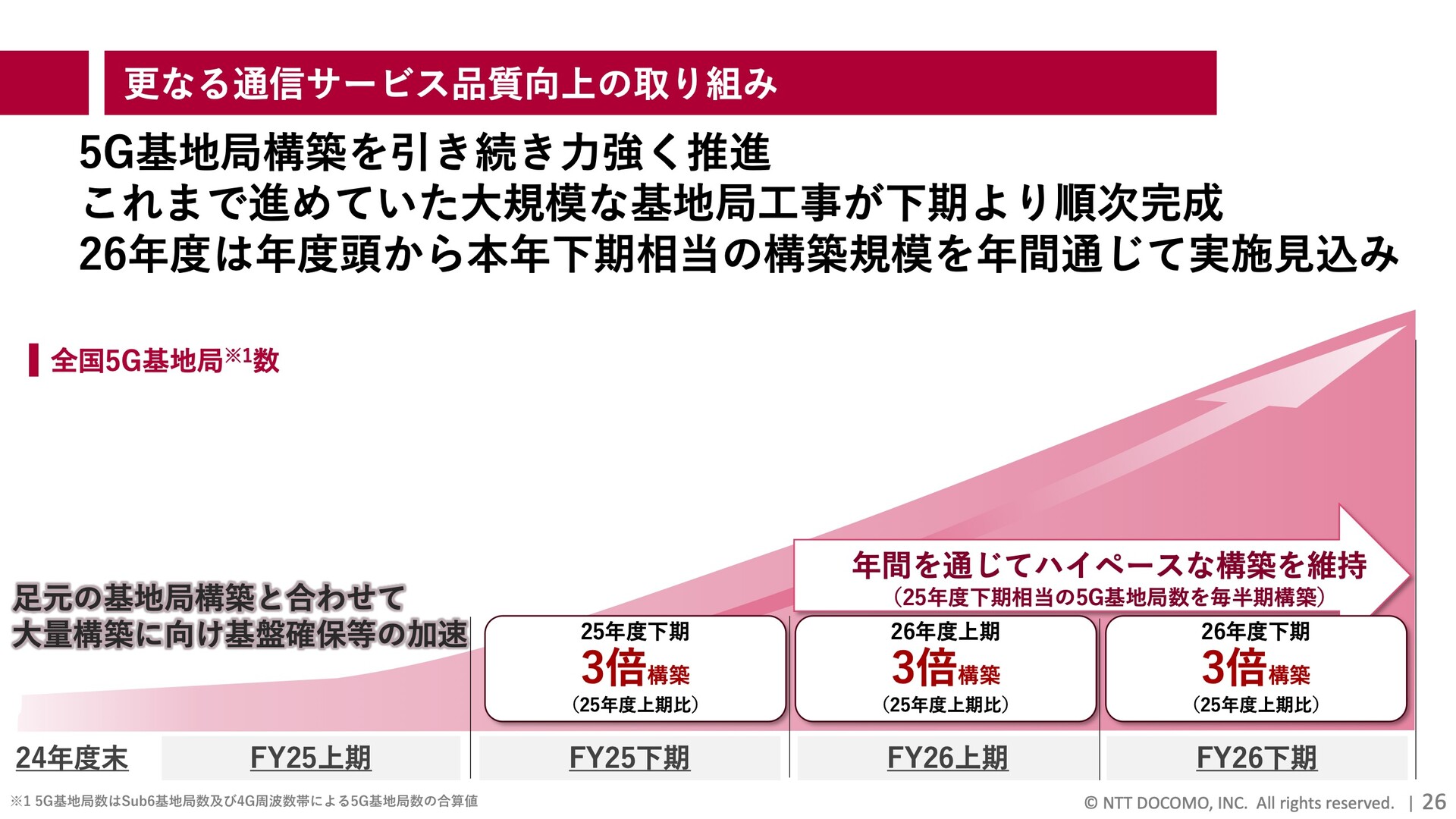 NTTドコモでは競争が激化している中でネットワーク品質の問題が続いているため、ネットワーク強靭化のための重点投資によって基地局構築・最新装置への入れ替えを加速しており、2025年下期は上期比で3倍のペースで5G基地局の構築し、設備投資費は2025年度Q3で5,658億(前年同期比+1,327億円、+30.6%)となったとのこと。また2026年度もこの3倍のペースのまま年間を通じて構築を維持していくとし、前田氏は「5G基地局構築エリアでは体感品質が確実に向上している」と紹介していました。