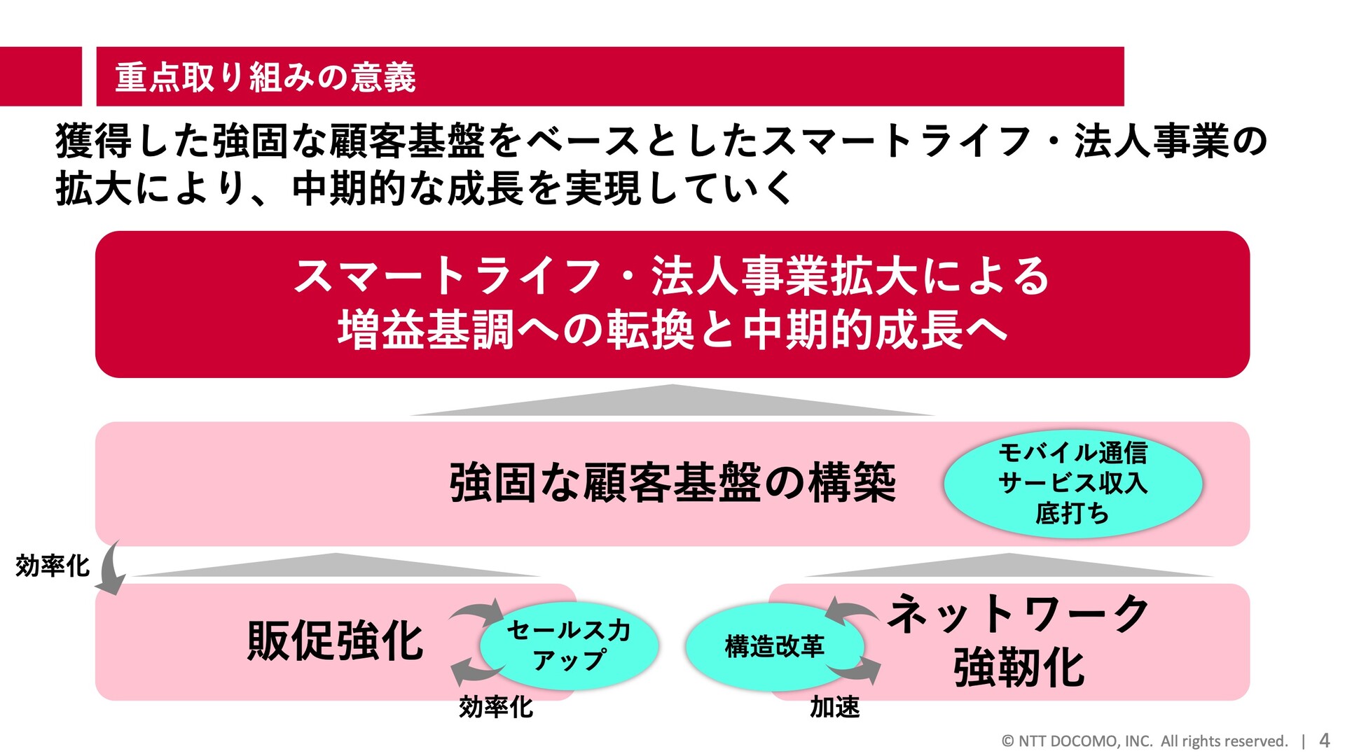 営業利益については特に携帯電話番号ポータビリティー(MNP)による他社との競争激化に伴う販促費用の増加や端末購入プログラム「いつでもカエドキプログラム」の収益悪化が響いているとし、MNPは4カ月連続でプラスとなっているものの、転出自体は前年比で1.2倍くらいとなっており、決算説明会に登壇したNTTドコモ 代表取締役社長を務める前田 義晃氏は「流動が活発になってきており、獲得に動いた」として「販促費を引き上げてしっかり競争していくスタンスをとった」と説明しました。