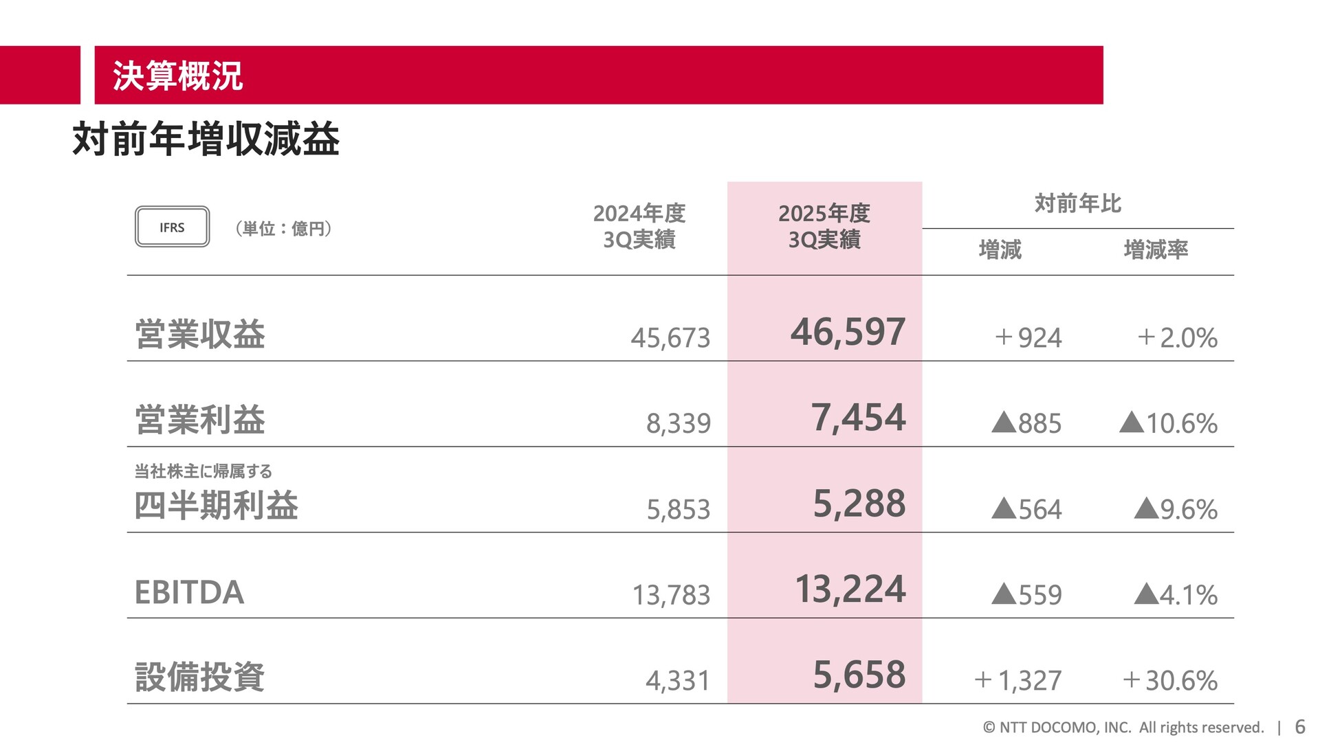 日本電信電話(以下、NTT)は5日、オンラインにて「2025年度第3四半期決算会見」を開催し、子会社のNTTドコモを含めた決算内容を発表しています。NTTドコモの2025年度第3四半期(Q3)は営業収益が4兆6,597億円(前年同期比+924億円、+2.0%)、営業利益が7,454億円(前年同期比△885億円、△10.6%)、EBITDAが1兆3,224億円(前年同期比△559億円、△4.1%)で増収減益となり、営業収益は過去最高となりました。
