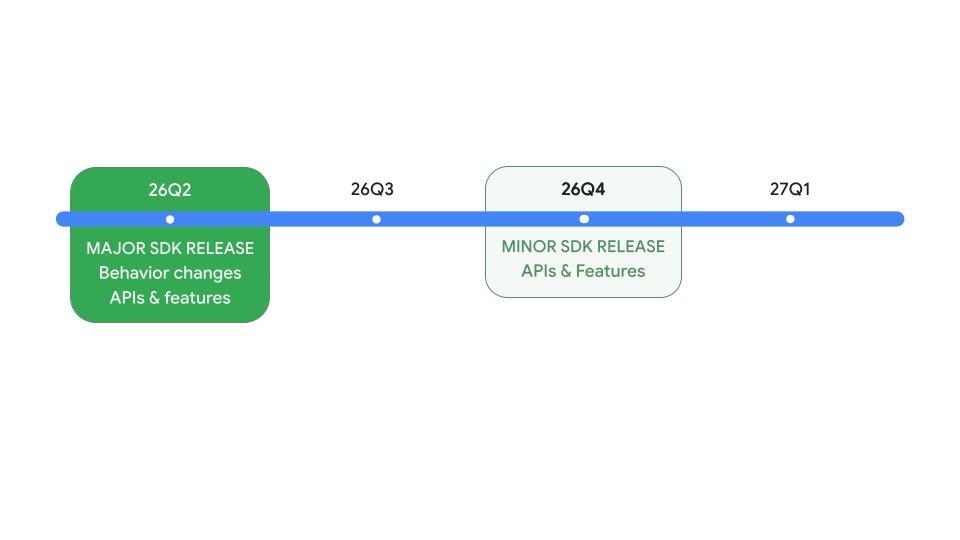 同社では昨年のAndroid 16から早めにリリースしてその年の後半に新たなAPIと機能を含むSDKを追加するマイナーバージョンアップを行うようにしており、今年も2026年第2四半期(Q2:4〜6月)にAndroid 17がリリースされ、2026年第4四半期(Q4:10〜12月)にマイナーバージョンアップをリリースする予定となっています。なお、以前はベータ版の前に開発者向けプレビュー版(Developer Preview)をリリースしていましたが、Androidではアルファ版として先行してリリースされるAndroid Canaryを提供開始しており、こちらに置き換えられています。