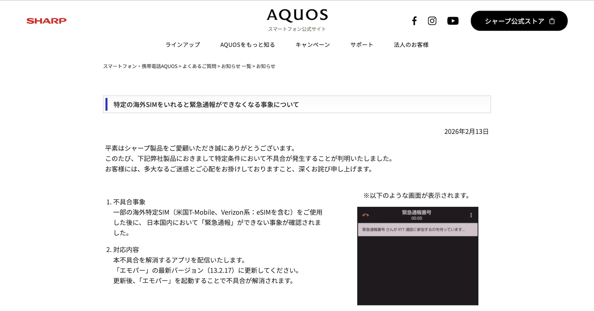 ・特定の海外SIMをいれると緊急通報ができなくなる事象について|お知らせ|よくあるご質問|AQUOS:シャープ