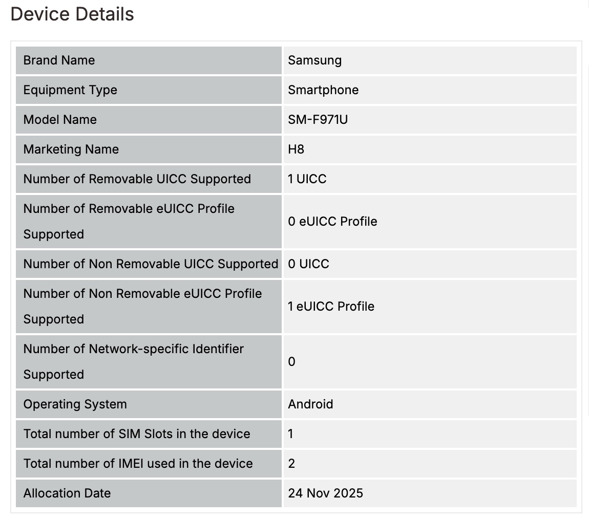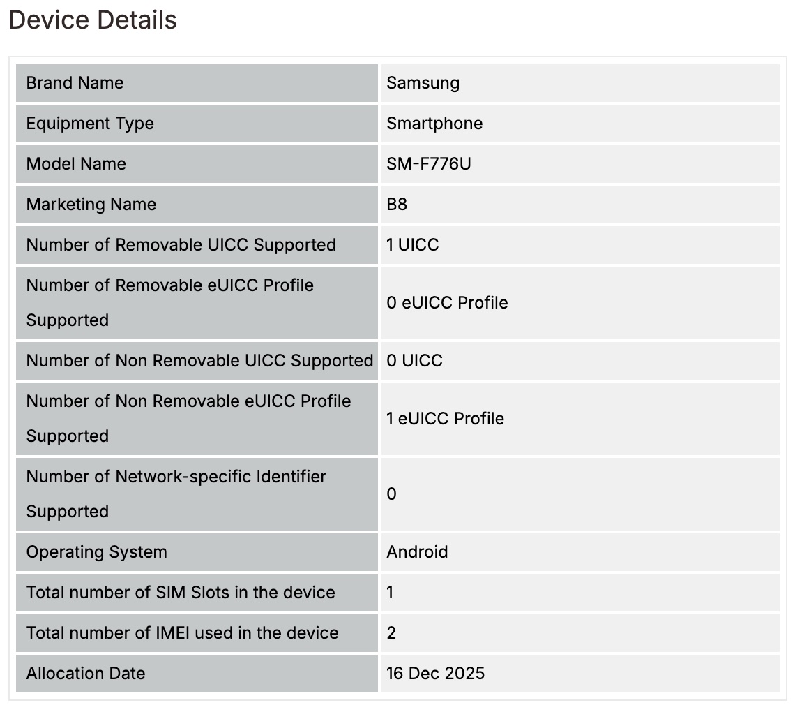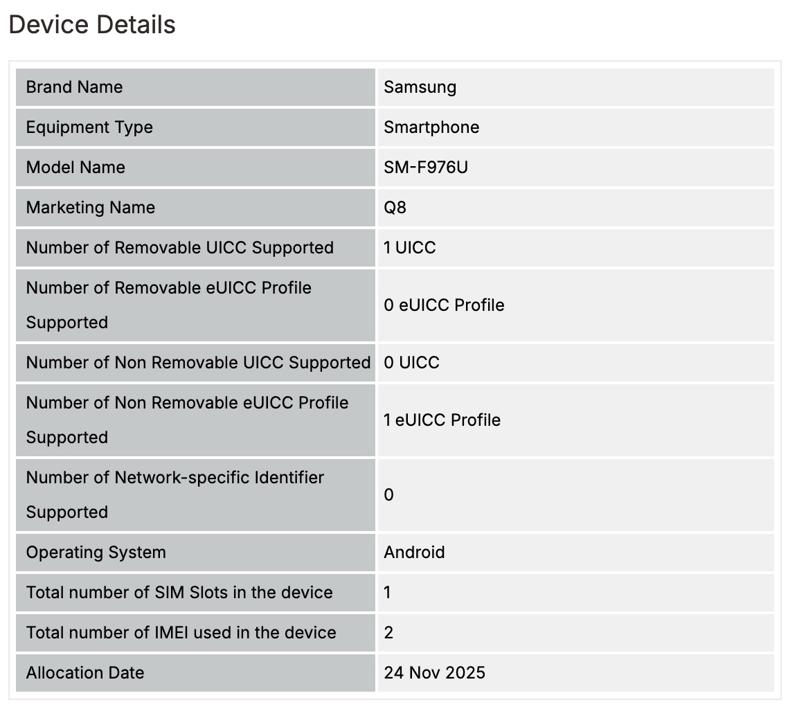 携帯電話関連の世界最大の業界団体であるGSMA(Global System Mobile Association)が運営する国際移動体装置識別番号(International Mobile Equipment Identity:IMEI)のデータベースにおいてSamsung Electronics(以下、Samsung)の未発表な次期フォルダブルスマートフォン(スマホ)「Galaxy Z Fold8」および「Galaxy Z Fold8 FE」、「Galaxy Z Flip8」(ともに仮称)と見られる開発機「Q8(型番:SM-F976U)」および「H8(型番:SM-F971U)」、「B8(型番:SM-F776U)」が登録されています。