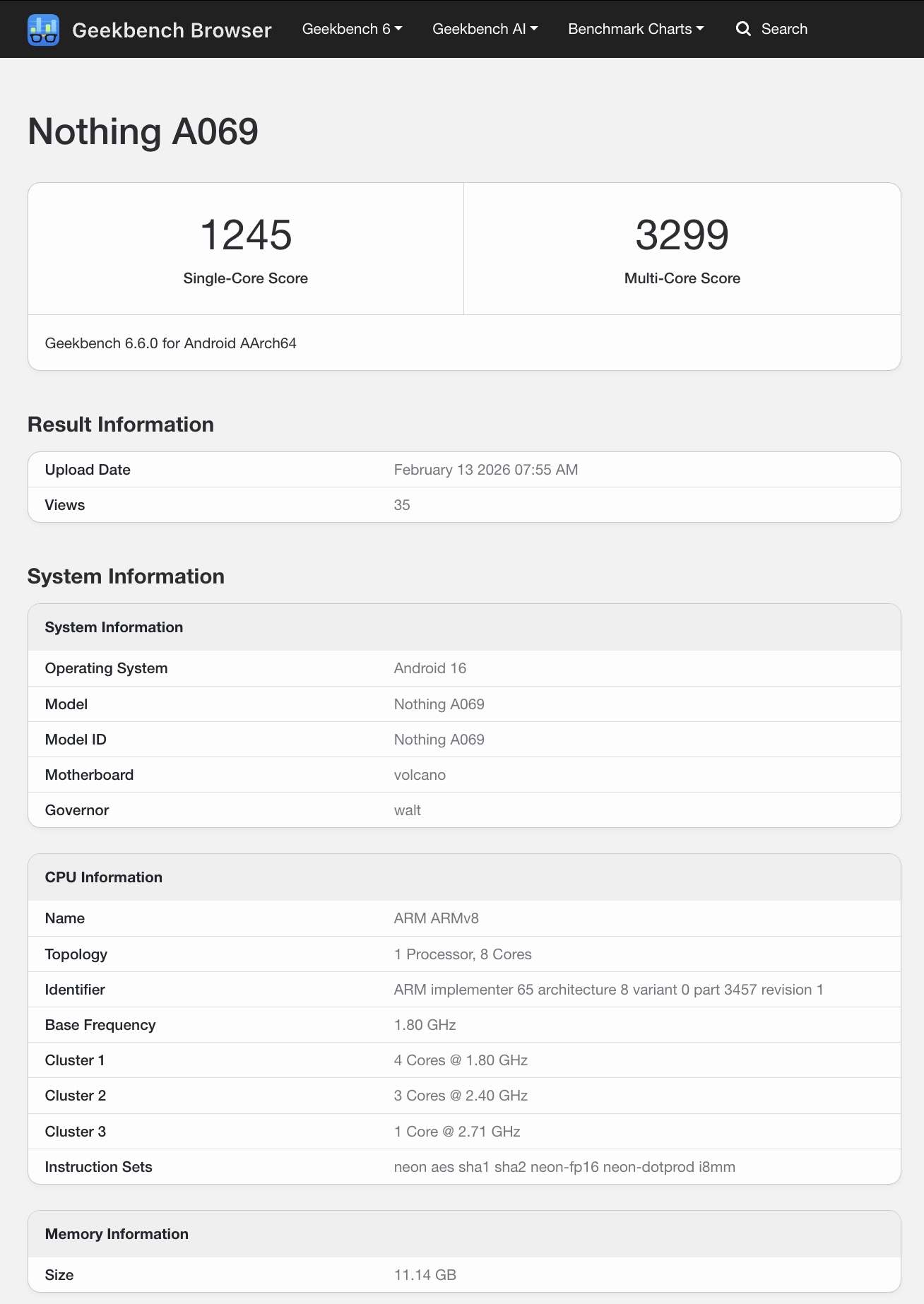 ・Nothing A069 - Geekbench 6 CPU Score - Geekbench