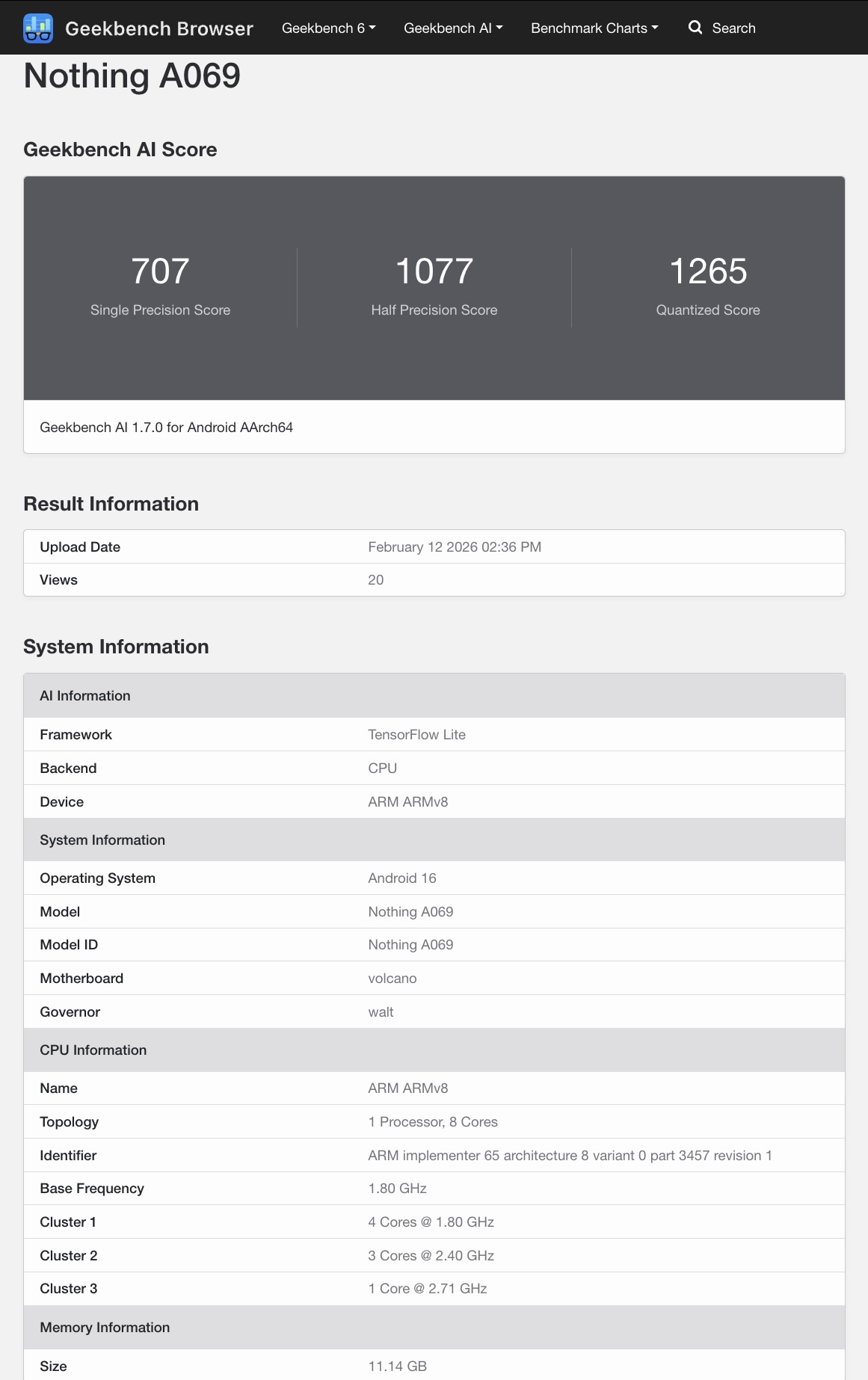 ・Nothing A069 - Geekbench AI Score - Geekbench