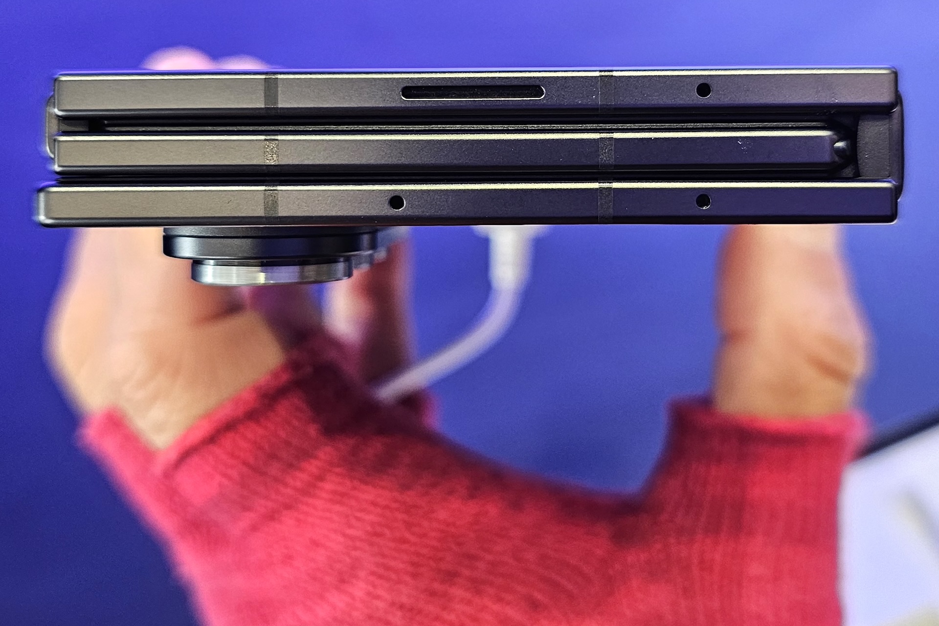 Galaxy Z TriFoldの開いた状態における背面。側面などのフレームは高強度ながら過度な重量増を防ぐ「Advanced Armor Aluminum」によるアルミニウム製、ヒンジの外装はチタン製に