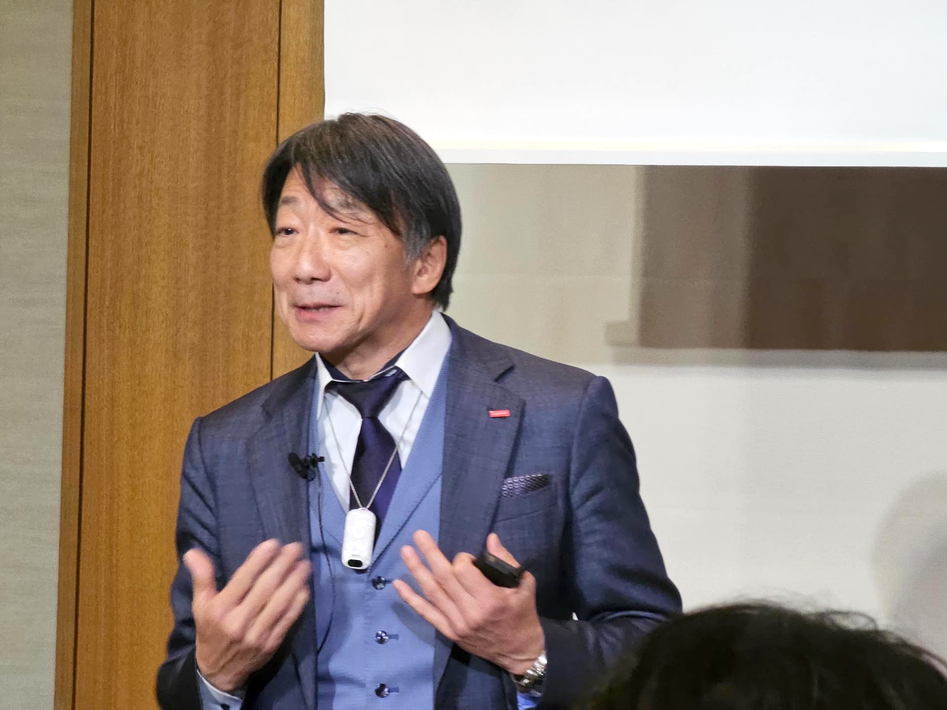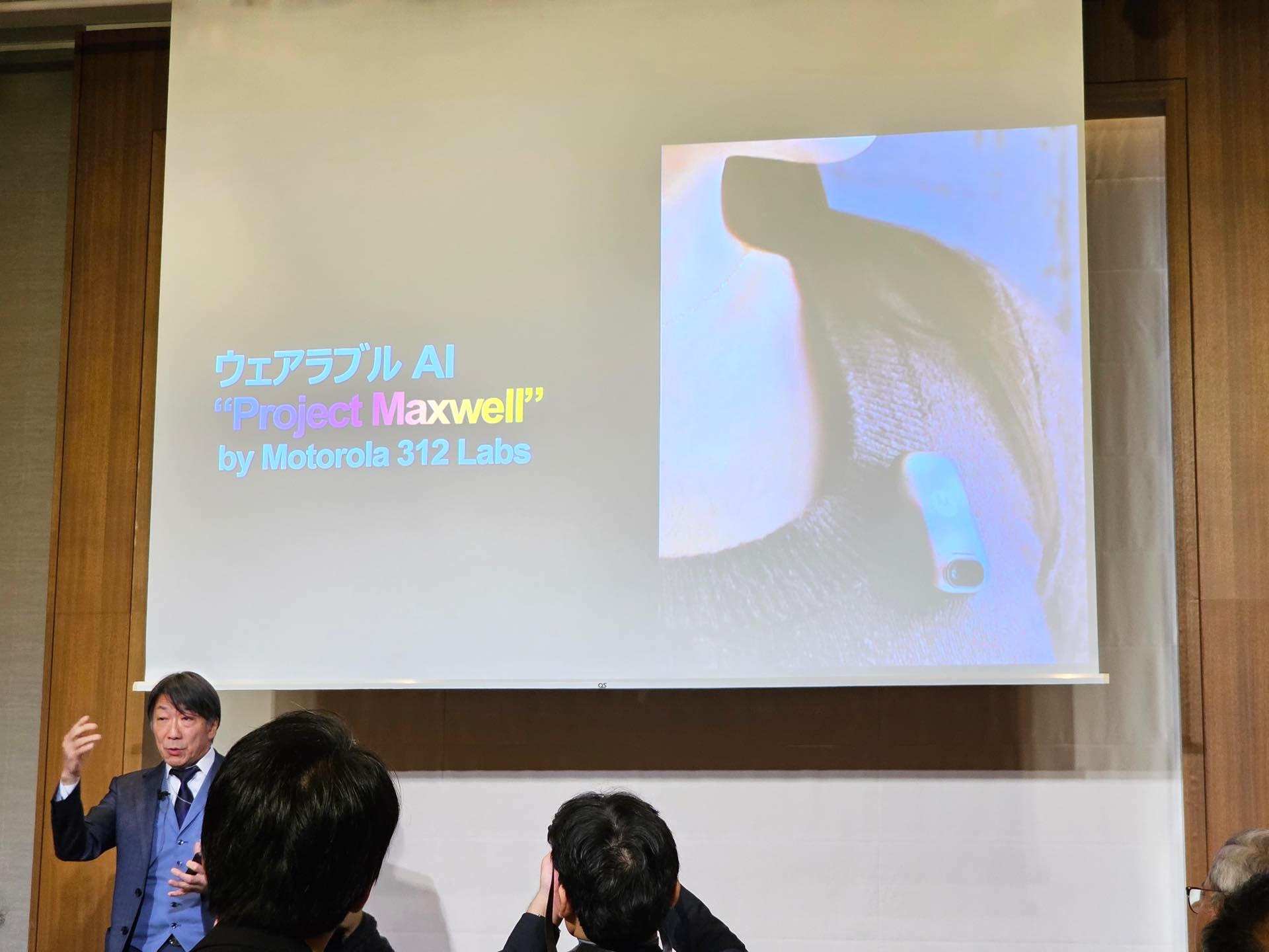 またLenovo Tech World 2026ではLenovoやMotorolaといったブランドを横断したパーソナルAIプラットフォーム「Qira」も発表されていましたが、記者説明会でも説明があり、Motorola 312 Labsが開発しているウェアラブルAI「Project Maxwell」もレノボ・ジャパン 代表取締役社長の檜山 太郎氏が身につけていたほか、基調講演終了後には展示もされていました。なお、会場に先着来場で300人に「Lenovo 65W デュアルUSB Type-C GaN ACアダプター」をプレゼントしたり、スタンプラリーを行っていたりしていました。