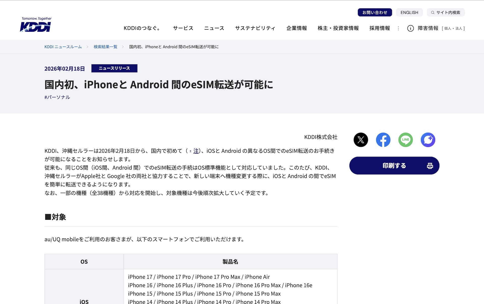 KDDIおよび沖縄セルラー電話は18日、携帯電話サービス「au」および「UQ mobile」においてiPhone(iOS)とAndroidの異なるOS間での「eSIM転送」(料金は当面無料)の手続きが2026年2月18日から可能になったと発表しています。一部の機種(2月18日時点で全38機種)から対応を開始し、対象機種は今後順次拡大していく予定とのこと。