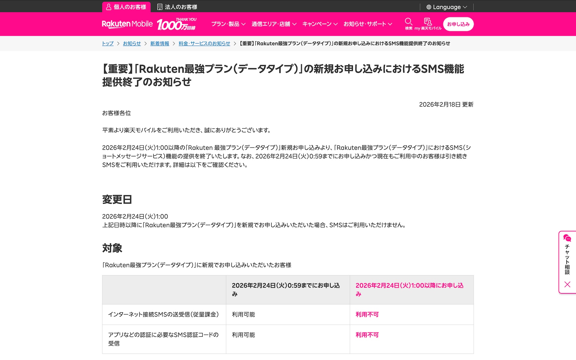 ・【重要】「Rakuten最強プラン(データタイプ)」の新規お申し込みにおけるSMS機能提供終了のお知らせ | 料金・サービスのお知らせ | 楽天モバイル