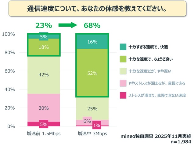 今回、その最大3Mbpsに増速するトライアルにおいてアンケートを実施し、最大1.5Mbpsでは「十分すぎる速度で、快適」および「十分な速度で、ちょうど良い」がそれぞれ5%と18%で合計23%だったのに対し、最大3Mbpsに増速した場合にはそれぞれ16%と52%で合計68%になったとし、動画コンテンツが主流化した今、1.5Mbpsでは少し物足りないと感じていた人も最大3Mbpsならより快適に利用できると判断して正式に最大3Mbpsで提供開始することになったということです。