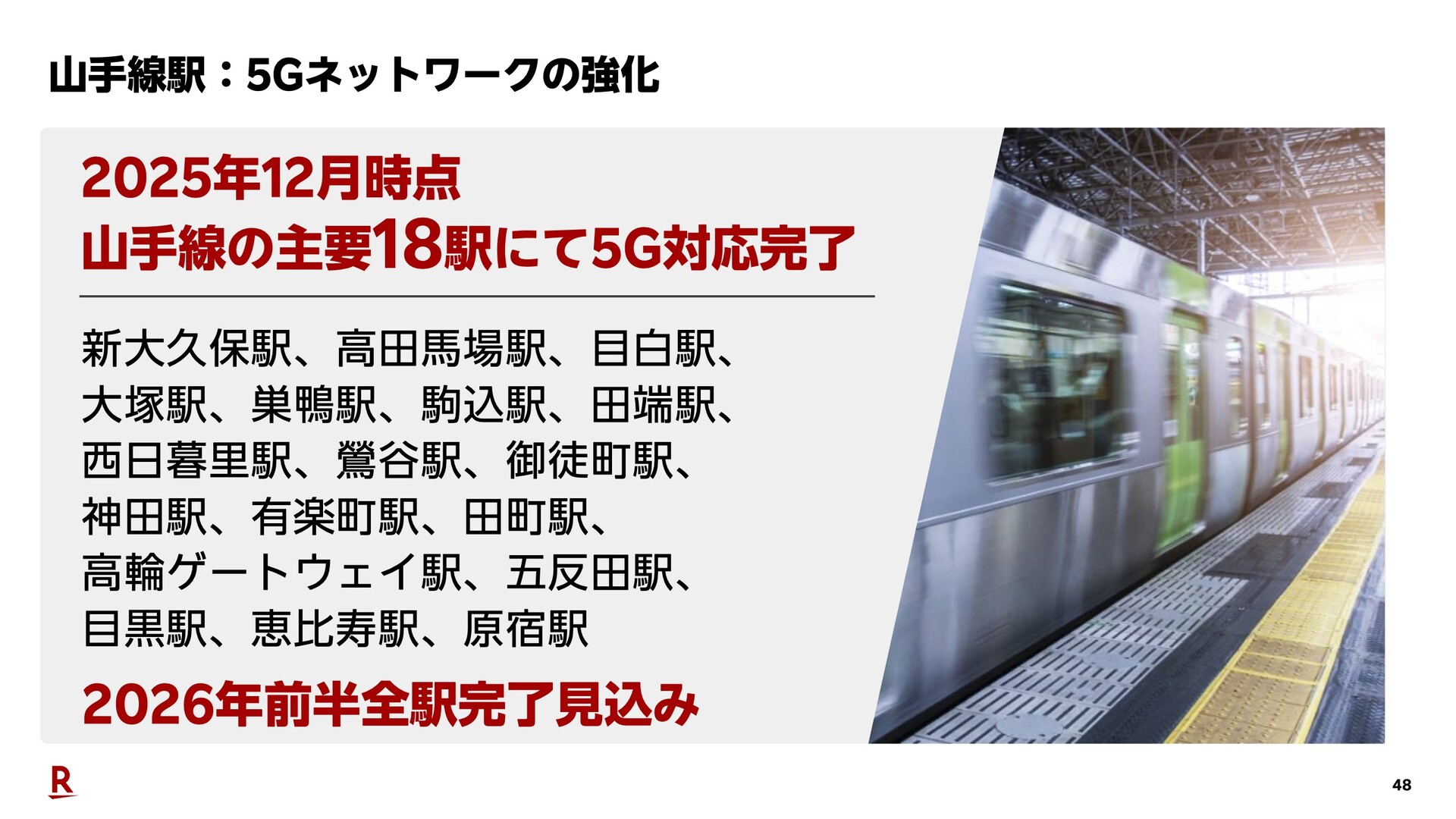 またすでに紹介しているように楽天モバイルでは「つながりやすさ強化宣言2026」としてトラフィックが集中するエリアなどでの通信品質向上を加速させており、鉄道では東日本旅客鉄道(以下、JR東日本)のJR山手線では2025年12月時点で主要18駅にて5G対応を完了していましたが、新たに2026年2月12日(木)に実施された楽天グループの「2025年度通期及び第4四半期 決算説明会」において残りの駅についても対応を進め、2026年前半全駅完了見込みであることが案内されています。