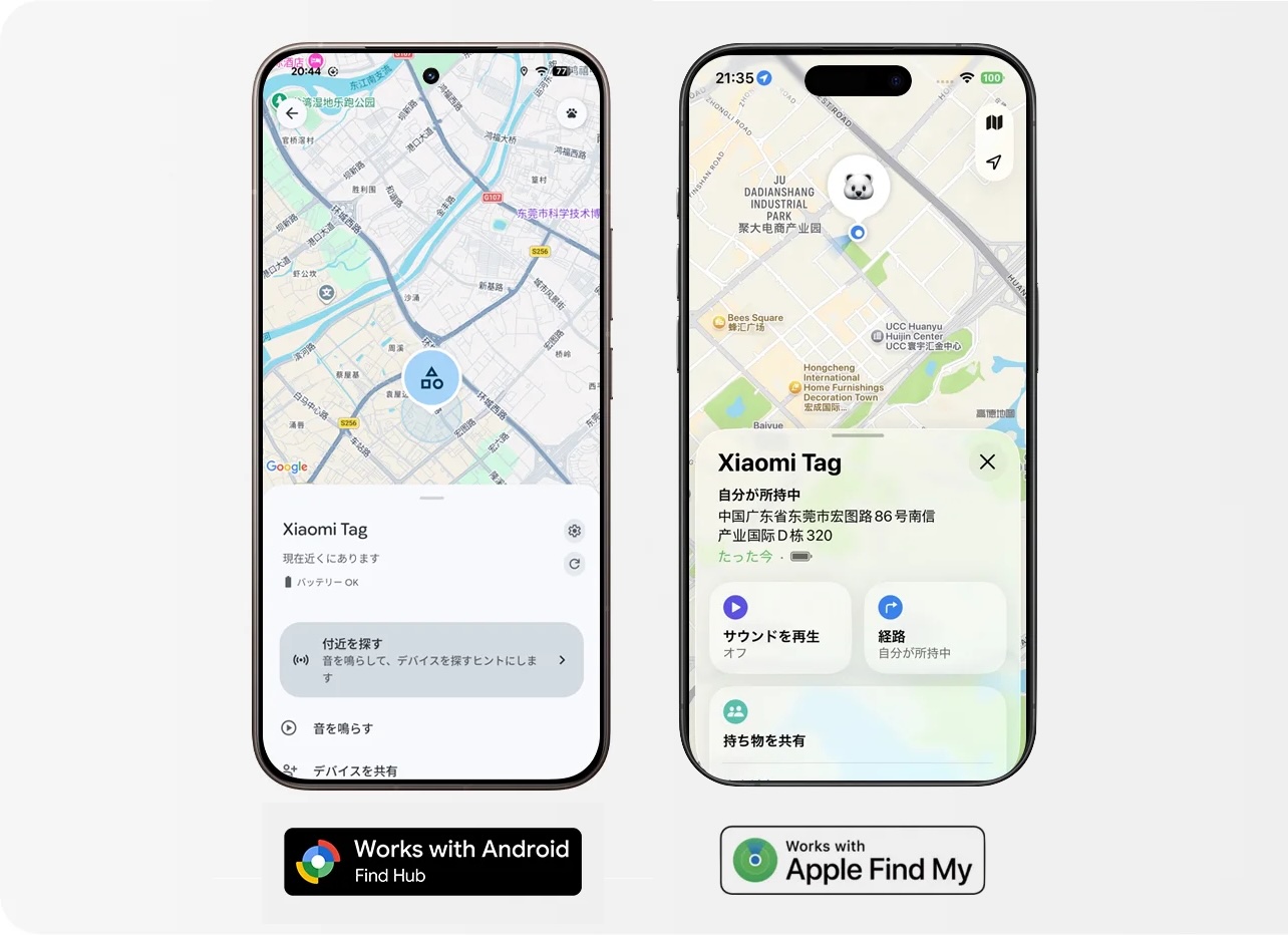 Xiaomi TagはXiaomi初のコイン型の紛失防止トラッカー/忘れ物防止タグで、Appleの「AirTag」やSamsung Electronicsの「Galaxy SmartTag」などと同等製品となっていますが、特徴としてはAppleの探すとGoogleのFind Hubの両方をサポートし、幅広いスマートフォン(スマホ)などとの互換性を確保しています。これにより、機種やOSを問わず、いつもの環境で迷わず持ち物を探せ、また内蔵の圧電ブザーで音でも探せるため、近距離の置き忘れにも強い設計です。