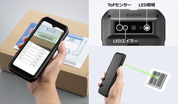 さらにDuraForce EXに搭載しているバーコード読み取りアプリと比べてより高速・高精度なバーコード読み取りライブラリーに加え、暗所でのスキャンを補助する高輝度LED照明とToFセンサー、狙ったコードを確実に捉えるLEDエイマーを搭載。倉庫の棚奥や薄暗い場所でも、スムーズで正確な読取り作業を可能にします。なお、LEDエイマーの利用には製品購入に加えて別途ライセンスの購入が必要となっているのでご注意ください。