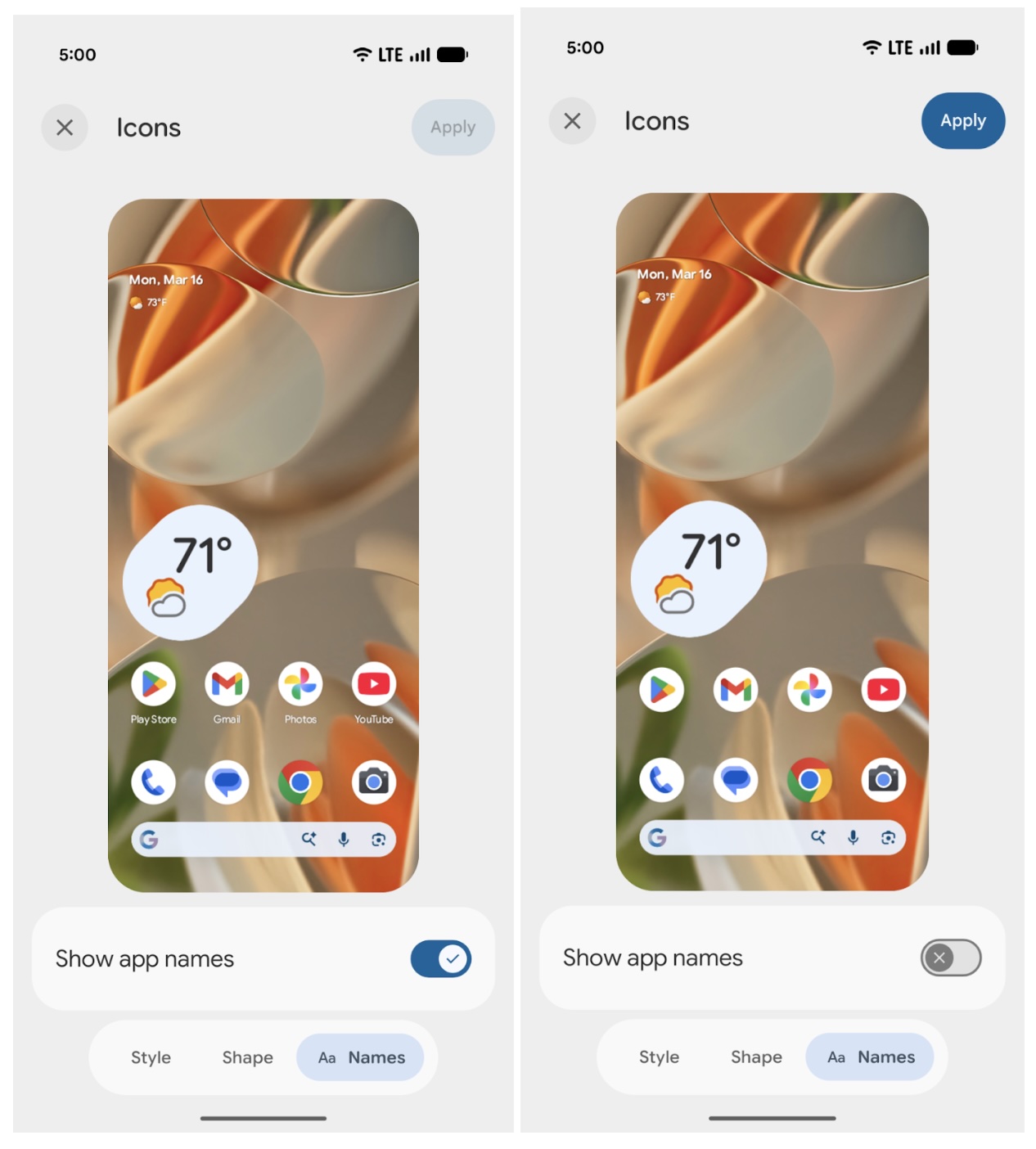Android 17ではホーム画面のワークスペースでアプリ名(ラベル)を非表示にする設定が利用できるようになりました。アプリのアイコンは他と区別しやすく、すぐに認識できるものにしてください。