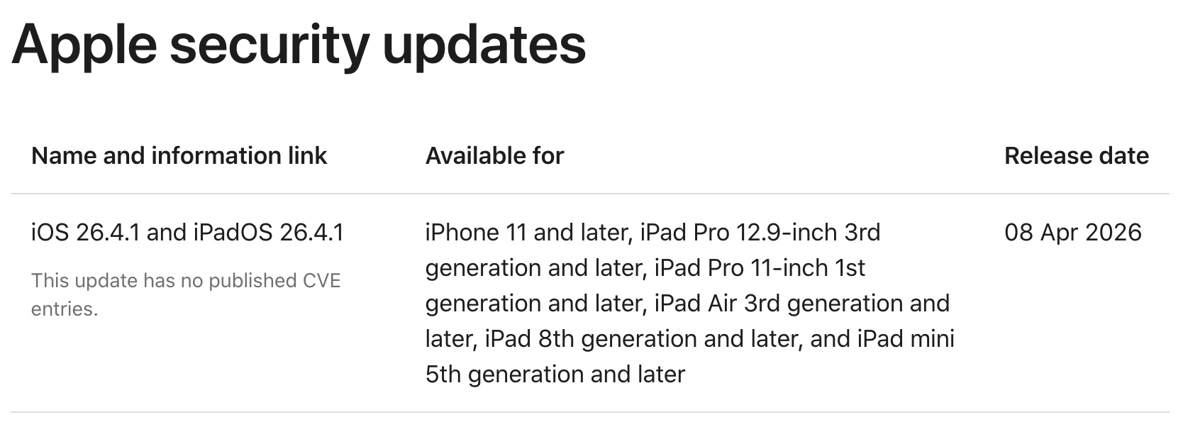 Appleは8日(現地時間)、同社が販売するスマートフォン(スマホ)「iPhone」シリーズ向けプラットフォーム「iOS」とタブレット「iPad」シリーズ向けプラットフォーム「iPadOS」の最新バージョン「iOS 26.4.1(23E254)」および「iPadOS 26.4.1(23E254)」を提供開始したとお知らせしています。変更点はバグ(不具合)の修正のみで、セキュリティーアップデートについては少なくともCVEに登録されている脆弱性はないということです。