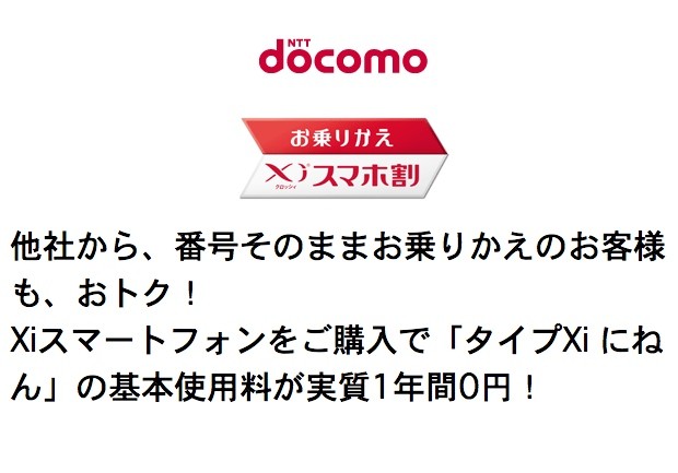 NTTドコモは31日、携帯電話番号ポータビリティー(MNP)制度を利用して他社から番号をそのままに乗り換える人を対象に基本使用料を実質1年間無料にする割引キャンペーン「お乗りかえXiスマホ割」を2013年6月1日(土)から実施するとお知らせしています。