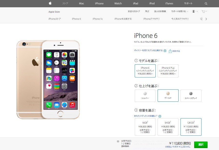 価格(税別)はiPhone 6の16GBが8万6,800円および64GBが9万8,800円、128GBが11万800円で、iPhone 6 Plusの16GBが9万8,800円、64GBが11万800円、128GBが12万2,800円。現在、各モデルとも1〜2営業日での出荷となっています。