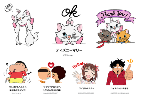 LINE Corp.は20日、無料通話・無料メールスマートフォンアプリ「LINE(ライン)」のトークで利用できるスタンプに新しくディズニーのアニメーション映画「おしゃれキャット」から「ディズニーマリー」、さらに、TVアニメ「アイドルマスター」や「ハイスクール!奇面組」の3種類を新たに配信開始したとお知らせしています。