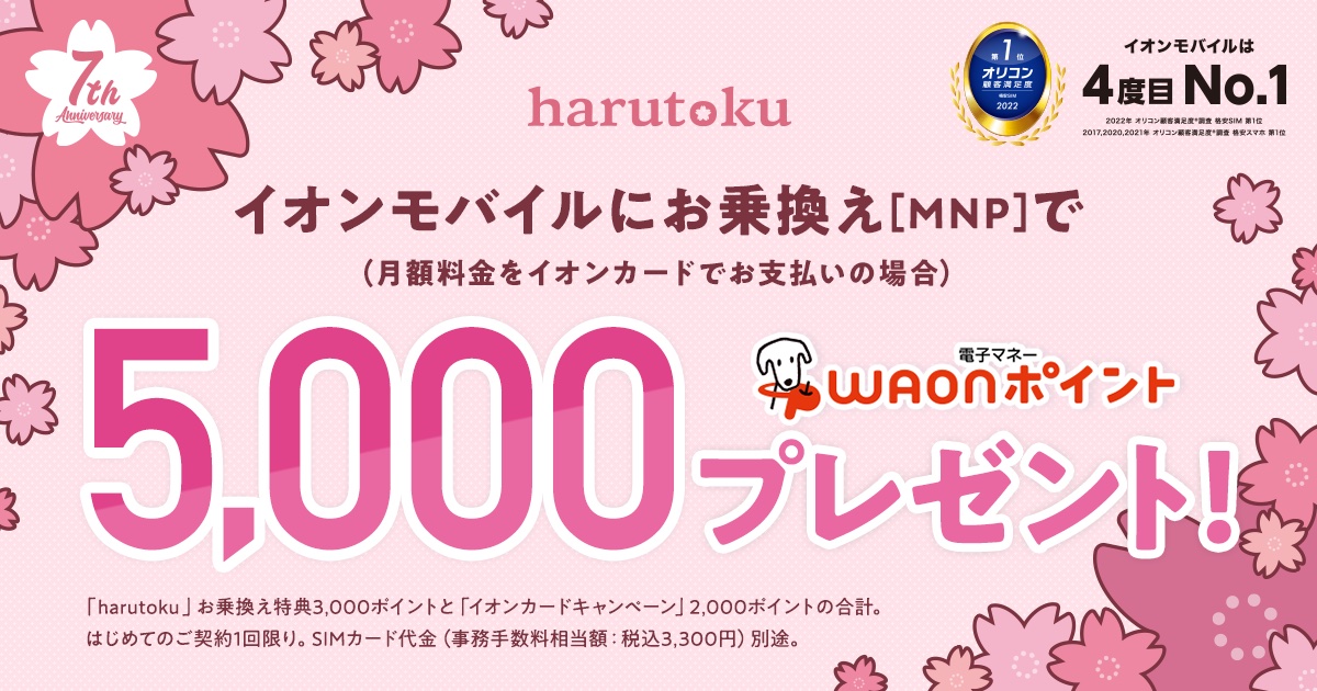 さらに料金プランのリニューアルに伴い、2024年4月1日(月)から5月31日(金)までの期間に他社から乗り換え(MNP)でイオンモバイルを契約して利用料金をイオンカードで支払うとWAONポイントで通常は2,000ポイントのところが6,000ポイントがプレゼントされ、さらにMNPと同時に対象スマートフォン(スマホ)を購入すると5,000ポイントが還元されるとのこと。対象スマホは「Redmi 12 5G」(8GB+256GBモデル)と「moto g24」となっています。