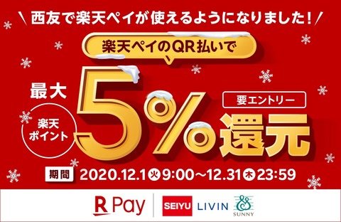 さらに楽天ペイ導入開始を記念して2020年12月31日(木)までの期間中に西友およびLIVIN、サニーの対象店舗で「【楽天ペイ 冬の大還元祭】西友・LIVIN・サニーで最大5%還元キャンペーン」を実施し、上記1.5%の還元と併せて利用合計金額に対して最大5%分の楽天ポイント(期間限定ポイント含む)をプレゼントしています。