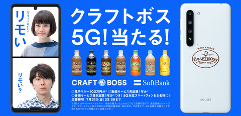 サントリー食品インターナショナルは2日、サントリーコーヒー「BOSS」とソフトバンクの携帯電話サービス「SoftBank」のコラボレーション企画として「クラフトボス5G!当たる!キャンペーン」( http://suntory.jp/28408/ )を2020年7月7日(火)9:00から7月31日(金)23:59まで実施すると発表しています。