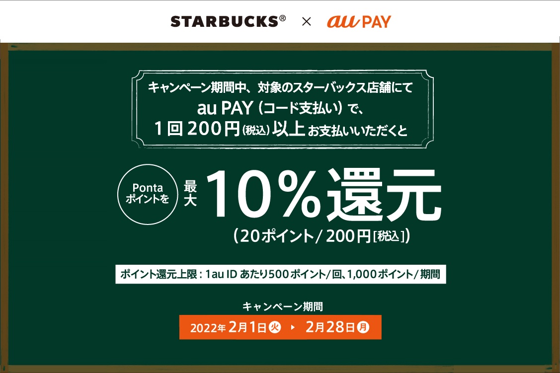 KDDIは31日、スターバックス コーヒー ジャパンが展開するコーヒーチェーン店「スターバックス」においてスマートフォン(スマホ)など向け決済サービス「au PAY(コード支払い)」で支払うと決済額の最大10%分のPontaポイントが還元される「au PAY×スターバックス|最大10%ポイント還元キャンペーン」を2022年2月1日(火)から2022年2月28日(月)まで実施すると発表しています。