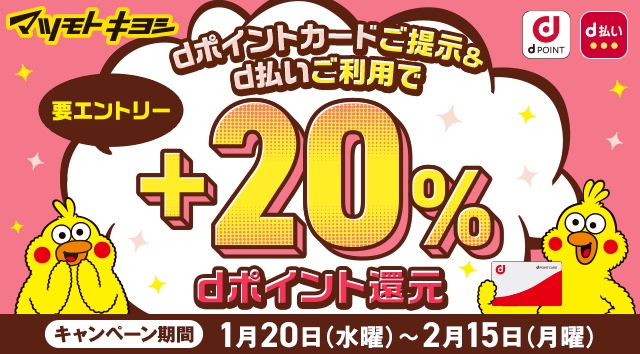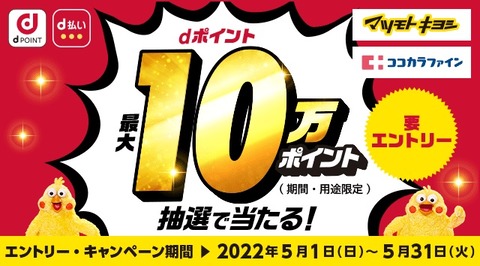 NTTドコモは1日、マツキヨココカラ&カンパニーが展開するドラッグストア「マツモトキヨシ」や「ココカラファイン」などにて「dポイントカード」を提示して「d払い」で支払うと抽選で最大10万ポイントのdポイント(期間・用途限定)が当たるキャンペーン( https://dpoint.jp/cp_2/matsukiyo_220501_3183/index.html )を2022年5月1日(日)から5月31日(火)まで実施するとお知らせしています。