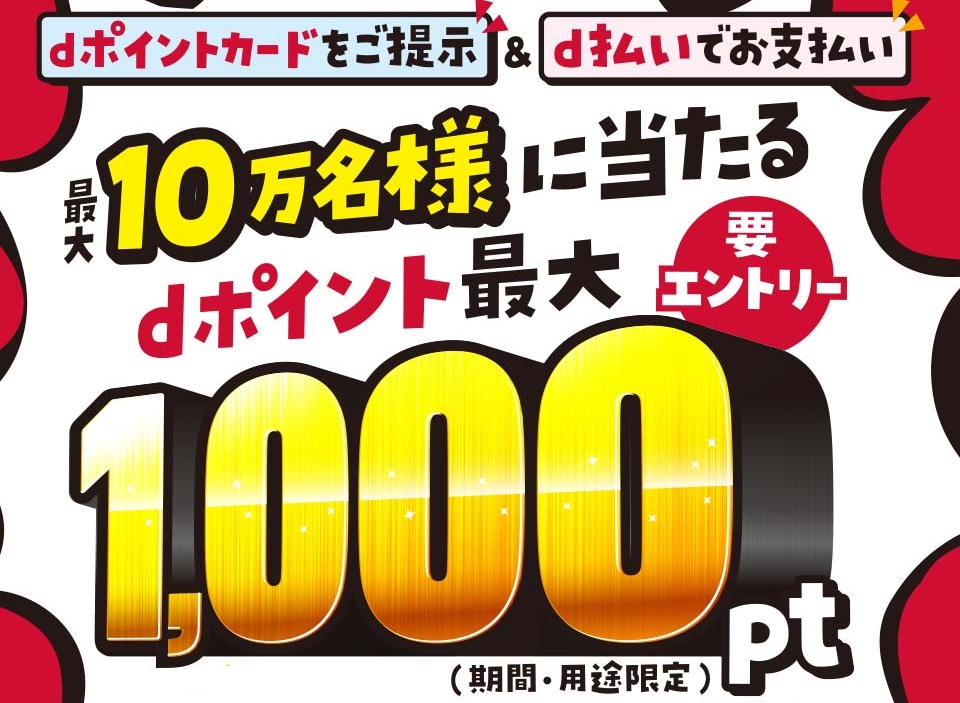 キャンペーンでは期間中に買い物の支払額が10,000円(税込)以上の場合に100,000ポイントが10人に、1,000円(税込)以上の場合に10,000ポイントが50人に、200円(税込)以上の場合に1,000ポイントが300人にプレゼントされます。キャンペーンに参加するにはキャンペーンWebページからエントリーが必要で、付与されるdポイントの有効期限は進呈日から約2か月です。