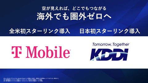 KDDIは17日、空が見えれば圏外エリアでも通信できる衛星とスマートフォン(スマホ)の直接通信サービス「au Starlink Direct」においてアメリカの移動体通信事業者のT-Mobileと提携してアメリカにおけるau Starlink Directのローミング接続を2025年度中に開始すると発表しています。