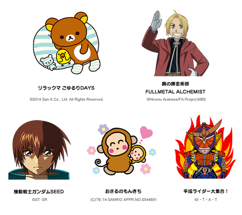 LINE Corp.は27日、無料通話・無料メールスマートフォンアプリ「LINE(ライン)」のトークで利用できるスタンプに新しく「鋼の錬金術師 FULLMETAL ALCHEMIST」および「機動戦士ガンダムSEED」、「おさるのもんきち」、「平成ライダー大集合」の4種類を新たに配信開始したとお知らせしています。また、すでに配信されていた「リラックマ」のLINEスタンプも新しい「リラックマ ごゆるりDAYS」が追加されています。