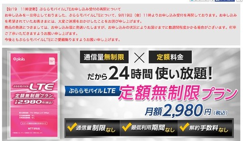 | ぷららモバイルLTEの申込みが再開! |