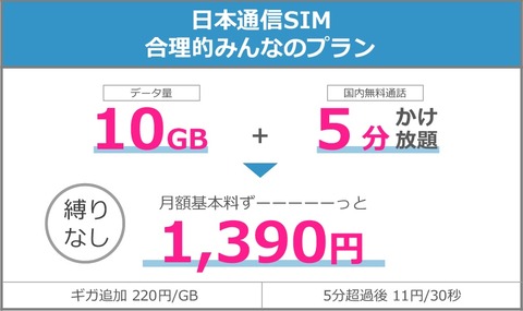 これにより、同社では「合理的な携帯料金プラン」を具現化したプランとしてデータ利用量が少ない場合には月1GBが付いた「合理的シンプル290プラン(月額290円)」、平均的利用の場合には10GB+5分かけ放題(または70分無料通話)が付いた「合理的みんなのプラン(月額1,390円)」、やや多い場合には合理的30GBプランを自信をもって提供するとしています。
