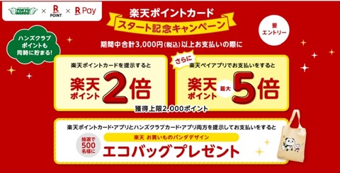 さらに楽天ポイントカードを提示してスマートフォン(スマホ)など向け決済サービス「楽天ペイ(アプリ決済)」で支払うと、さらに+3倍の合計5倍の楽天ポイントが付与されるとのこと。また会計時に楽天ポイントカードとハンズクラブカードの両方を提示した人を対象に抽選で500人に「お買いものパンダデザイン エコバッグ」をプレゼントするということです。