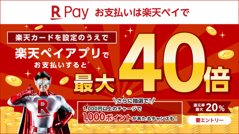 キャンペーンでは期間中にキャンペーンWebページにてエントリーの上、全国にあるセブン銀行ATMで楽天ペイアプリを通じて楽天キャッシュに1,000円以上チャージし、支払い元を楽天キャッシュに設定した楽天ペイアプリのコード払い・セルフ払いで支払いをすると、支払額(税込)の最大20%分の「楽天ポイント」が還元されます。