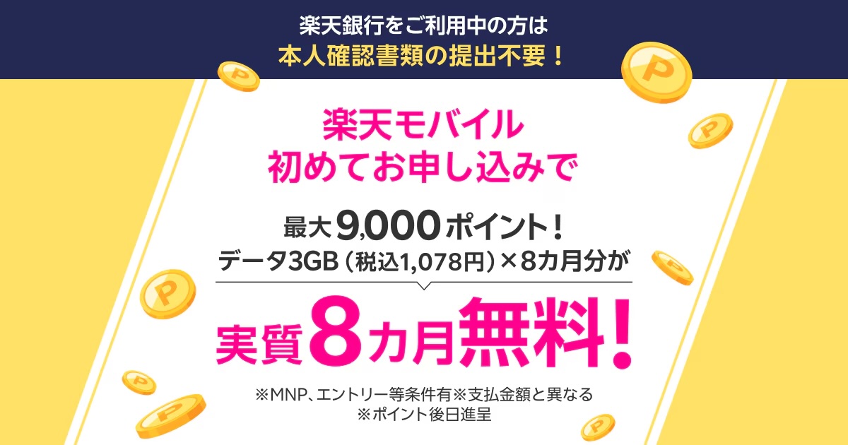 | キャンペーン「【常時開催】楽天銀行会員様へ 楽天モバイル初めてのお申し込み&他社から電話番号そのまま乗り換えで最大9,000ポイント!」がスタート! |