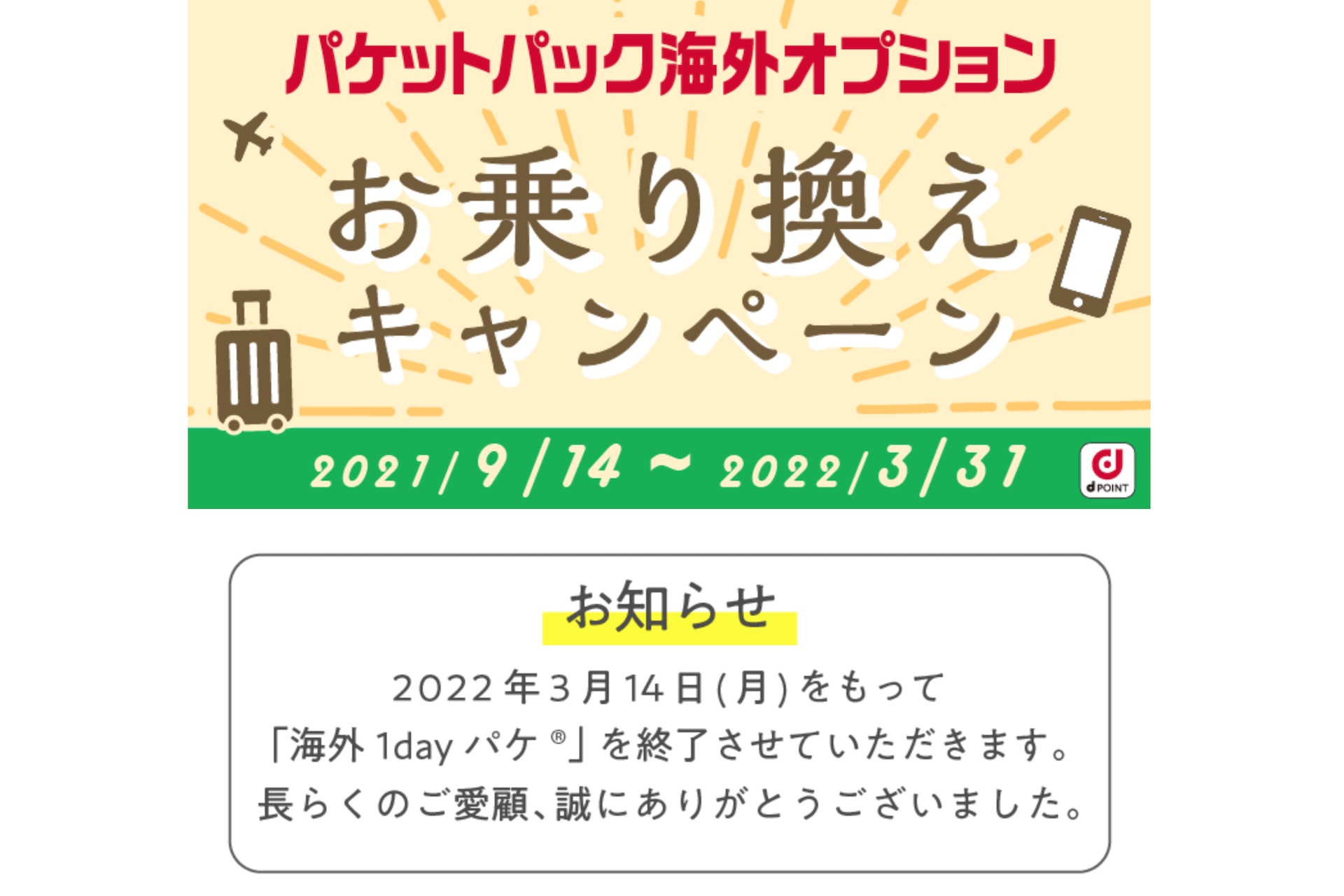 また海外1dayパケの提供終了に伴い、2021年9月14日(火)から専用のキャンペーンWebページでエントリーの上でパケットパック海外オプションを新規で申し込んだ場合を対象に最大500ポイントのdポイント(期間・用途限定)を進呈する「パケットパック海外オプションお乗り換えキャンペーン」を実施しています。
