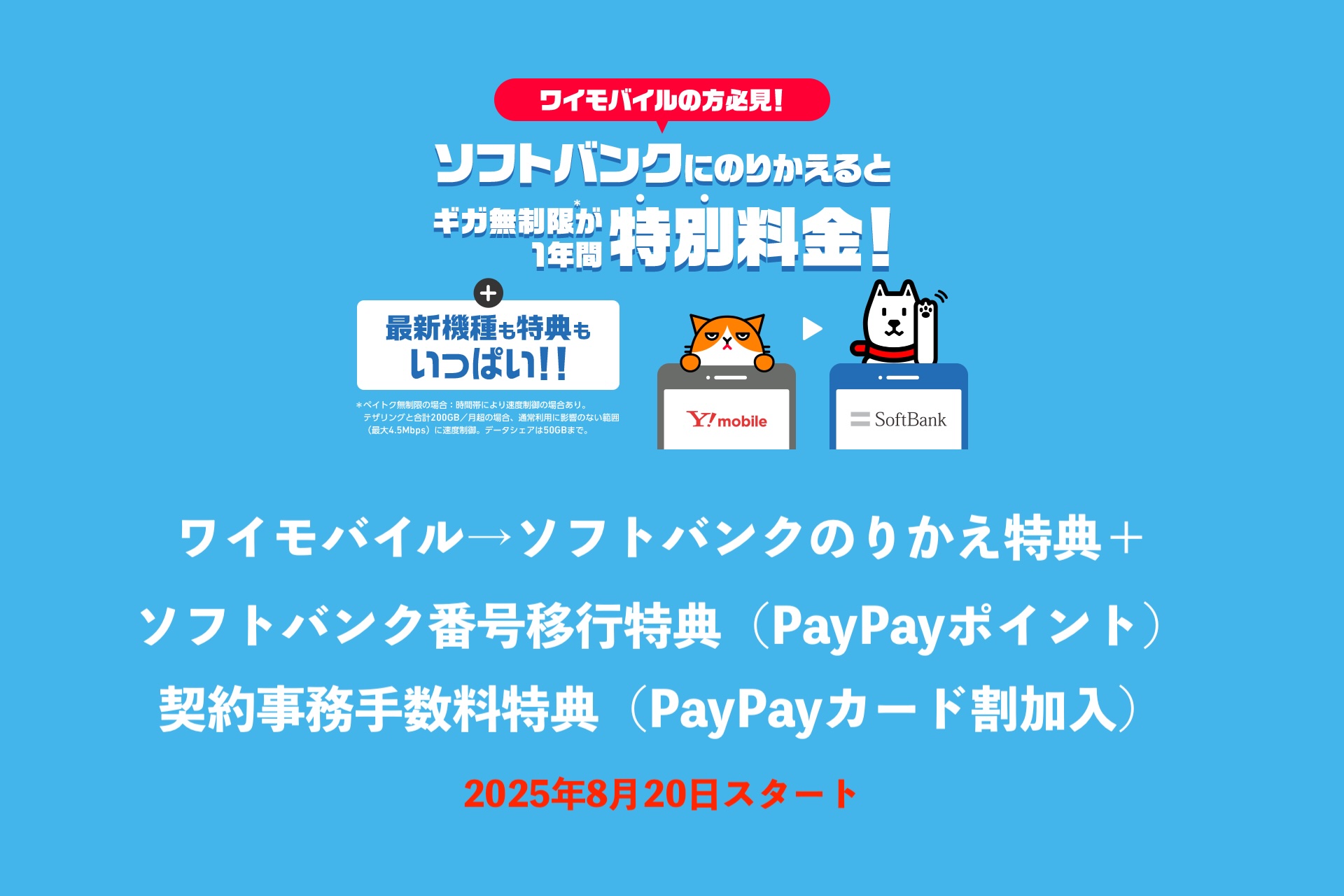 ソフトバンクは6日、適用条件を満たした上で携帯電話サービス「Y!mobile」から「SoftBank」に乗り換え(以下、番号移行)をした場合を対象に新たなキャンペーン「ワイモバイル→ソフトバンクのりかえ特典+」および「ソフトバンク番号移行特典(PayPayポイント)」、「契約事務手数料特典(PayPayカード割加入)」の提供を2025年8月20日(水)に開始するとお知らせしています。