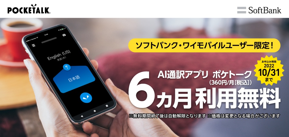 ソースネクストの子会社であるポケトークおよびソフトバンクは13日、携帯電話サービス「SoftBank」および「Y!mobile」においてiPhoneやAndroidといったスマートフォン(スマホ)を利用している人を対象にAI通訳アプリ「ポケトーク」(