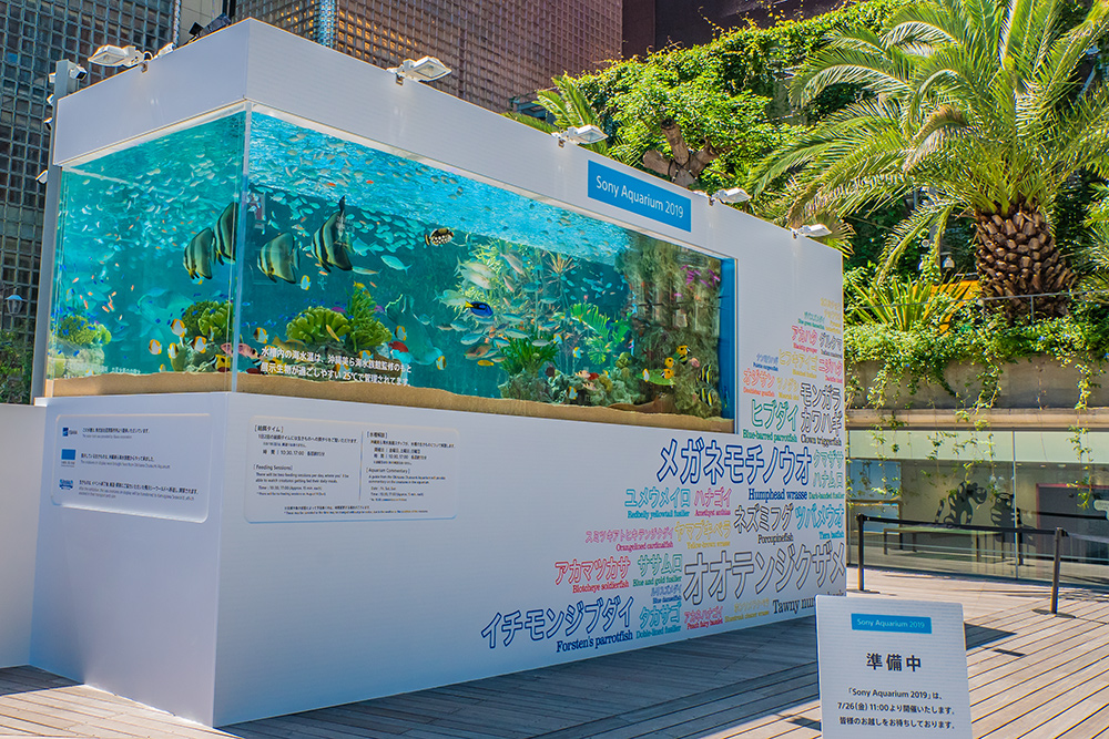 ソニーが東京・銀座にて運営する「Ginza Sony Park(銀座ソニーパーク)」で沖縄美ら海水族館の監修するイベント「Sony Aquarium 2019」を7月26日より開催しており、都会の真ん中に約30種類1000匹の色彩豊かな海の生き物が泳ぐ巨大水槽を設置し涼を呼び景色を作り出している。