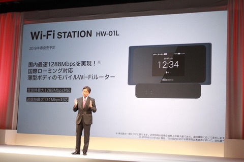 NTTドコモは1日、昨年10月に発表した「2018-2019冬春モデル」のうちの国内最速かつ国内で初めて理論値ながら通信速度が1Gbpsを超えた下り最大1288Mbpsに対応したモバイルWi-Fiルーター「Wi-Fi STATION HW-01L」(Huawei Technologies製)の予約受付を2019年3月4日(月)に開始するとお知らせしています。