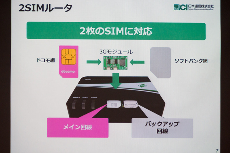 2SIMルータは仮想移動体通信事業者(MVNO)としてNTTドコモとソフトバンクの2つの携帯電話網を借り入れ、NTTドコモ網を主回線、ソフトバンク網を副回線として使うことで、主回線に何らかの障害が発生した場合に副回線に切り替わって通信を継続できるというもので、ATMやPOSレジ、カード決済など、IoT(モノのインターネット)やM2M(Machine to Machine)など向けとなるとのこと。